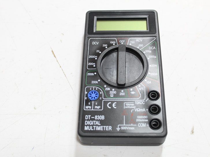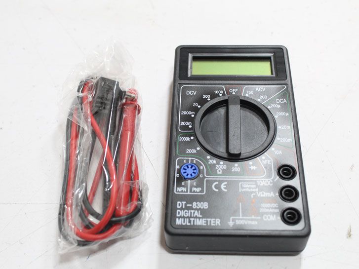 Мультиметр цифровой DT-830B Многофункциональный, компактный цифровой мультиметр DT-830B – необходимый инструмент в сумке любого электромонтера или радиолюбителя.Безопасность устройства реализована благодаря защите всех пределов от перегрузок и автоиндикации перегрузок. Тестер имеет небольшие размеры 126х70х28 мм и легкий вес – 137 г, благодаря чему вполне может уместиться в кармане. DT-830B – это прибор, объединивший в себе функции амперметра, вольтметра и омметра. Основное предназначение устройства – получение точных данных измерений силы постоянного тока, напряжения (постоянного и переменного), сопротивления. Также при помощи этого тестера проводят проверку диодов, транзисторов. Данные отображаются LCD-дисплее. Мультиметр имеет высокую чувствительность(100 мкВ) и небольшую погрешность измерений (1%) Мультиметр комплектуется щупами, которые в зависимости от вида измерений вставляются в одно из 3-х гнезд: гнездо “COM” – общее для всех измерений; гнездо ”10 А” – для измерения больших токов (до 10 А); гнездо для всех остальных измерений. Прибор как нельзя лучше подойдет домашним мастерам и начинающим радиолюбителям, которые только начали вникать в радиотехнику. Технические характеристики мультиметра DT-830B: Постоянное напряжение - 1000 В, переменное напряжение - 750 Постоянный ток - 10 А Сопротивление - 2 МОм Проверка коэффициента усиления транзисторов (PNP/NPN): + Тест диодов: + Индикация разряда батареи: + Индикация перегрузки: + Рабочая температура: 23+/-5 ?С, влажность не более 75 % Число положений поворотного переключателя:19 Питание: “Крона” 9 Дисплей: LCD Количество гнезд: 3 Габаритные размеры: 12.6 х 7 х 2.8 см Вес: 137 гр Комплектация мультиметра DT-830B: Мультиметр дт 830 В Техническое описание мультиметра dt 830b (на русском) Щупы Батарея 9 В Картонная упаковка
