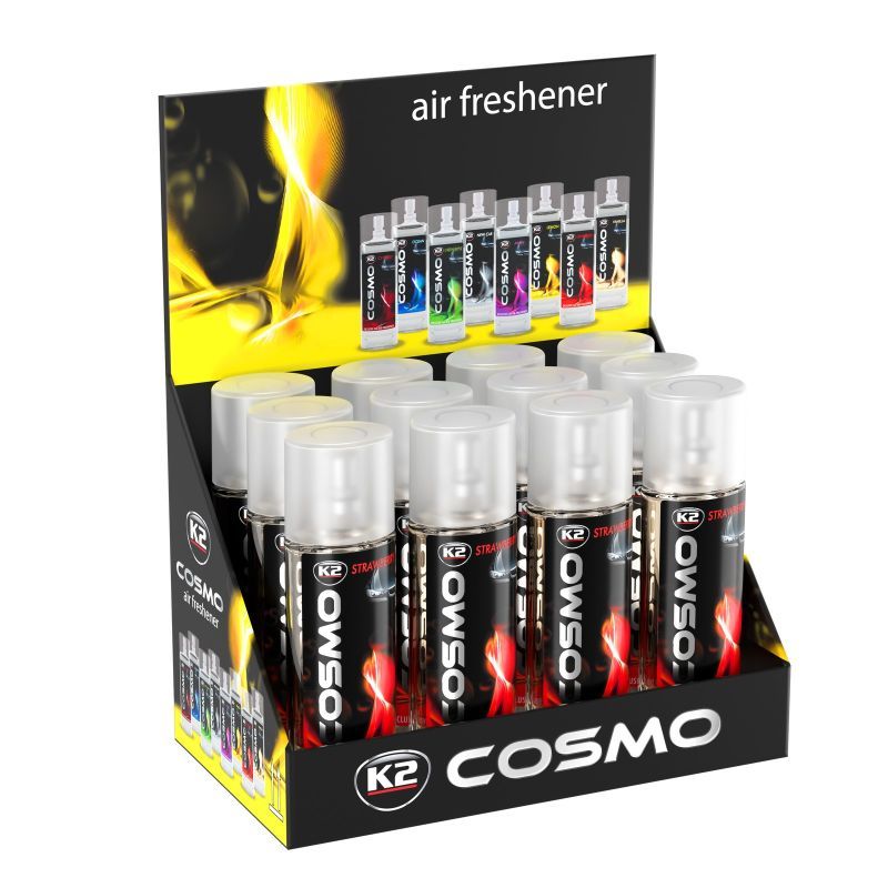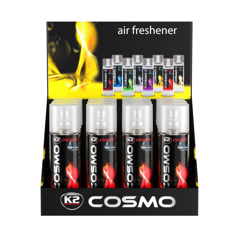 Освежитель воздуха Клубника 50мл COSMO STRAWBERRY Автомобильный освежитель воздуха с распылителем. Для всех, кто ценит элегантный стиль. Деликатная композиция освежителя воздуха K2 COSMO нейтрализует и поглощает все нежеланные запахи. Салон автомобиля надолго заполняется приятным ароматом. K2 COSMO можно распылять в воздухe либо на обивку автомобильного салона.