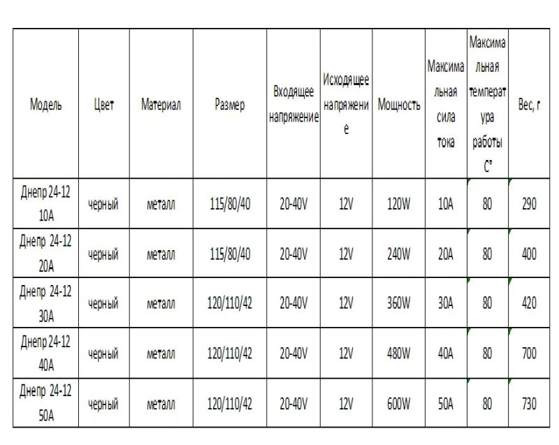 Перетворювач напруги Дніпро 24V-12V 50А 600W Імпульсний автомобільний перетворювач, що знижує вхідну напругу 24B до 12B постійного вихідного струму. Використовується для підключення побутових та віконних приладів, у тому числі: відеореєстратора; камери спостереження; сирени; сигналізації; аудіо/відео техніки та ін. практично будь-яких девейсів, що працюють під навантаженням 120-600 Baт! (Таблиця) Прилад використовується в лініях резервного живлення, перетворює струм генератора, а також акумуляторні батареї з напругою 24 вольт. Інші галузі використання: катери, сонячні та вітрові електрогенопатори, для аварійної роботи і т. д. Перетворювач особливо корисний водіям вантажівок, харчування бортової мережі яких дорівнює 24B. Перетворювач напруги 12в розрахований на максимальну силу струму 0-50 Ампер (див. таблицю). Підключається до акумулятора або автомобільного прикурювача. Корпус пристрою виготовлений з металу, має світлову індикацію. З боків є отвори для кріплення і отвори для охолодження, завдяки чому перетворювач 24v-12v не перегрівається. Для більш ефективного відведення гарячих мас, всередині передбачений радіотор, а також встановлені вентилятори охолодження. У пристрій інтегровані системи захисту від: неправильної полярності; навантаження; перегріву; короткого замикання. Мережевий шнур перетворювача із запобіжником виключає поломки внаслідок перепадів напруги